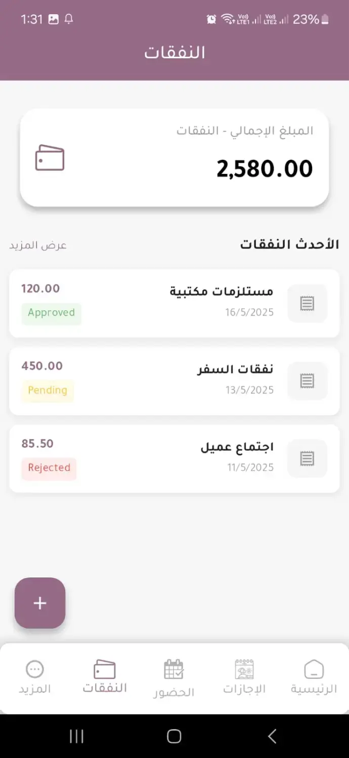 قدّم طلب نفقات مثل السفر أو المستلزمات المكتبية، وأرفق الفواتير وتابع حالة الطلبات (مقبول – معلق – مرفوض).