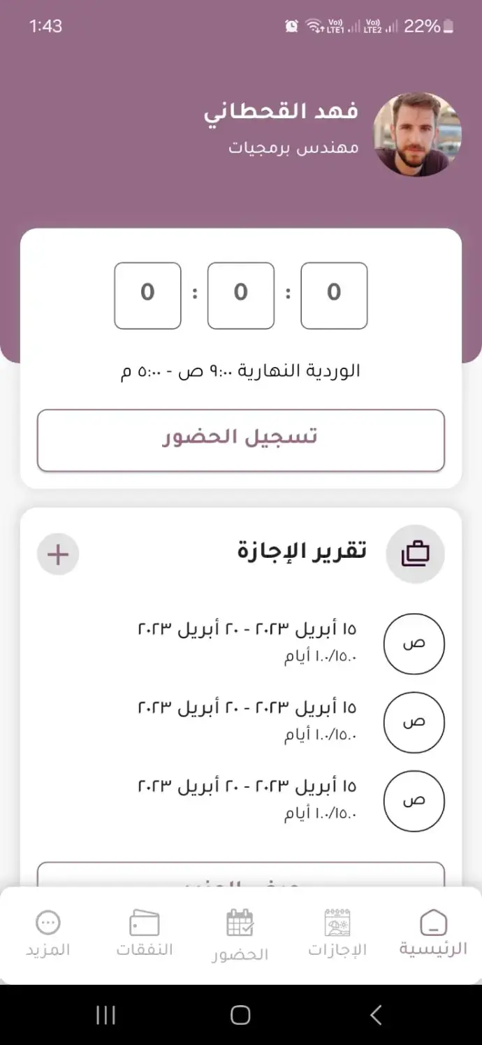 سجّل حضورك من الهاتف في ثوانٍ. التطبيق يعرض سجل الحضور والانصراف بالأوقات الدقيقة لكل يوم.